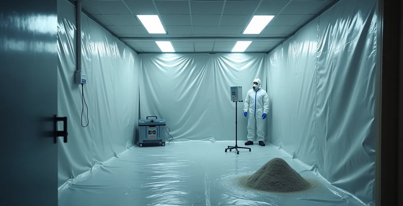 Comprendre ce protocole permet de justifier l’investissement. Il ne s’agit pas de « gonfler la facture », mais d’appliquer une procédure de sécurité non négociable. Le processus est méthodique et rigoureux, transformant une partie de votre maison en une véritable « salle blanche » en pression négative.