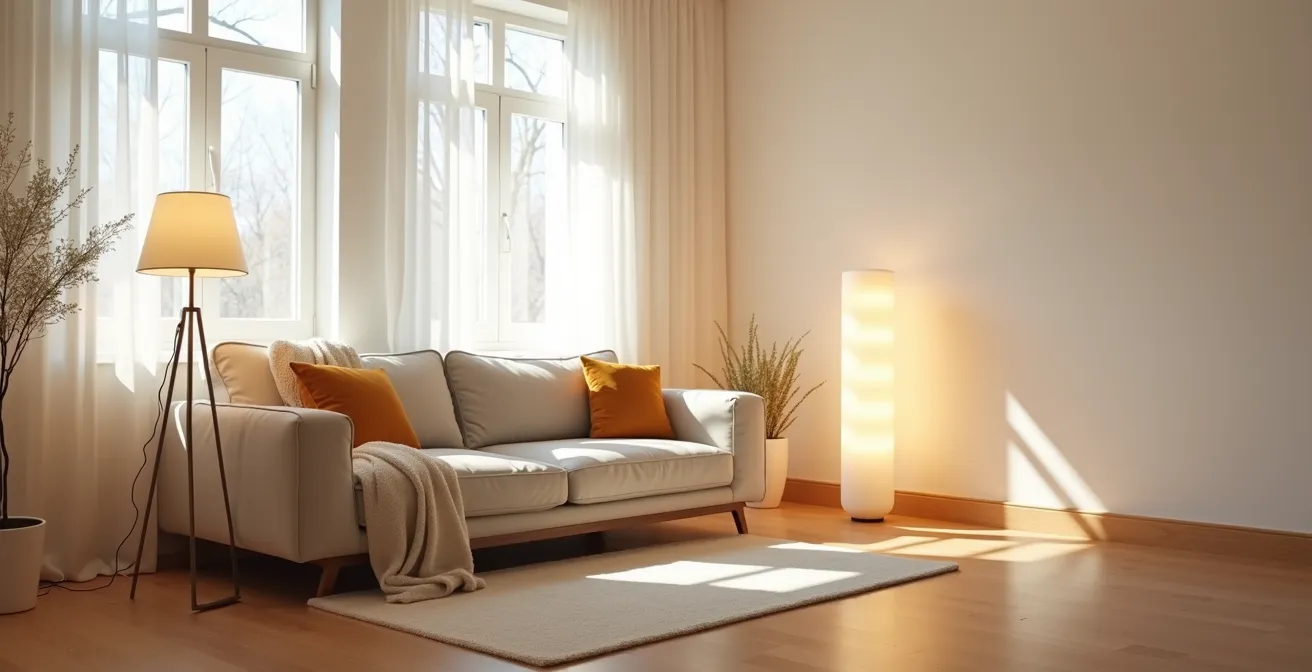 L’éclairage unique et direct d’un plafonnier, souvent appelé éclairage zénithal, est l’ennemi numéro un de la relaxation. En fin de journée, cette lumière crue et uniforme inonde la pièce, efface les reliefs et crée des ombres dures. Psychologiquement, cela maintient notre cerveau en état d’alerte, un peu comme la lumière agressive d’un bureau ou d’un commerce. Le soir, notre système nerveux a besoin de signaux lui indiquant qu’il est temps de ralentir, ce qu’un plafonnier seul ne peut fournir.
